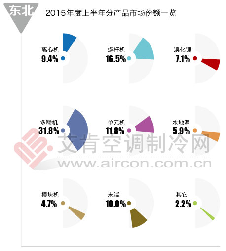 依靠大項(xiàng)目撐起整體銷(xiāo)量,中小項(xiàng)目零散的特點(diǎn)的東北市場(chǎng)。2015上半年大項(xiàng)目并不如人意,國(guó)家招標(biāo)項(xiàng)目的減少,使得離心機(jī)、螺桿機(jī)等水系統(tǒng)產(chǎn)品均出現(xiàn)不同程度的下滑。